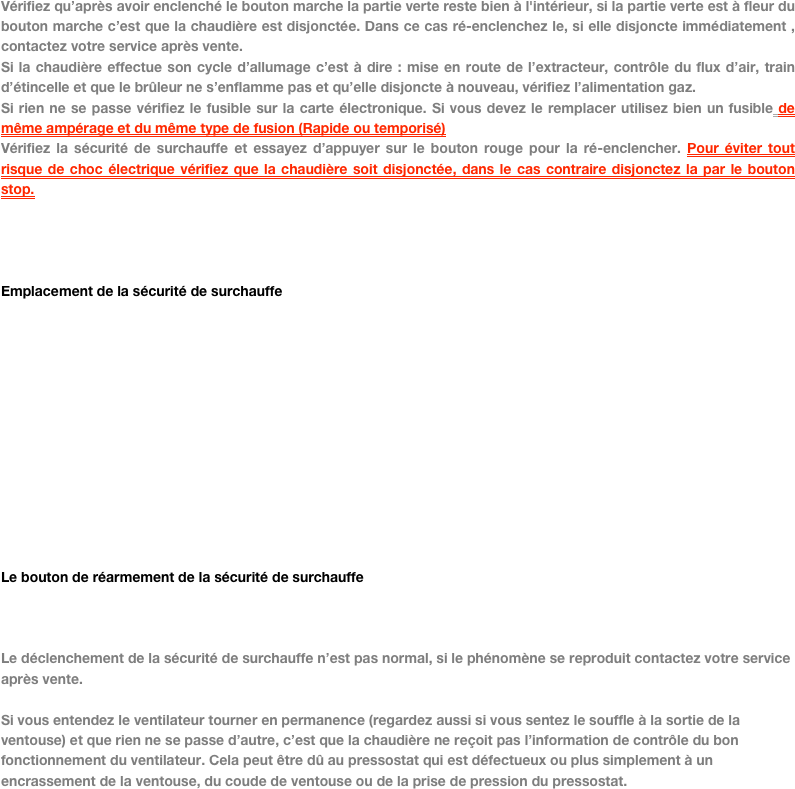 Faites un puisage d’eau chaude sanitaire, vérifiez que vous ayez un débit d’enclenchement suffisant à savoir au moins 3 l/mn . Si le débit est insuffisant, par exemple un filet d’eau, la chaudière ne s’enclenchera pas . Si tel est le cas, vérifiez que les aérateurs des robinets ne soient pas bouchés. Si c’est juste à un robinet que ça coule mal alors que les aérateurs sont propres , faites vérifier votre robinet. Si ça coule mal à tous les robinets c’est sûrement le corps de chauffe de votre chaudière qui est bouché, dans ce cas contactez votre service après vente. N’essayez pas de le déboucher vous même avec de l’acide, vous risquez de l’endommager définitivement (coût environ 300 €). Un détartrage réussi s’effectue avec une détartreuse.